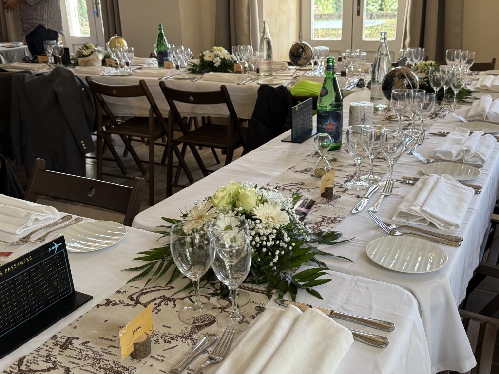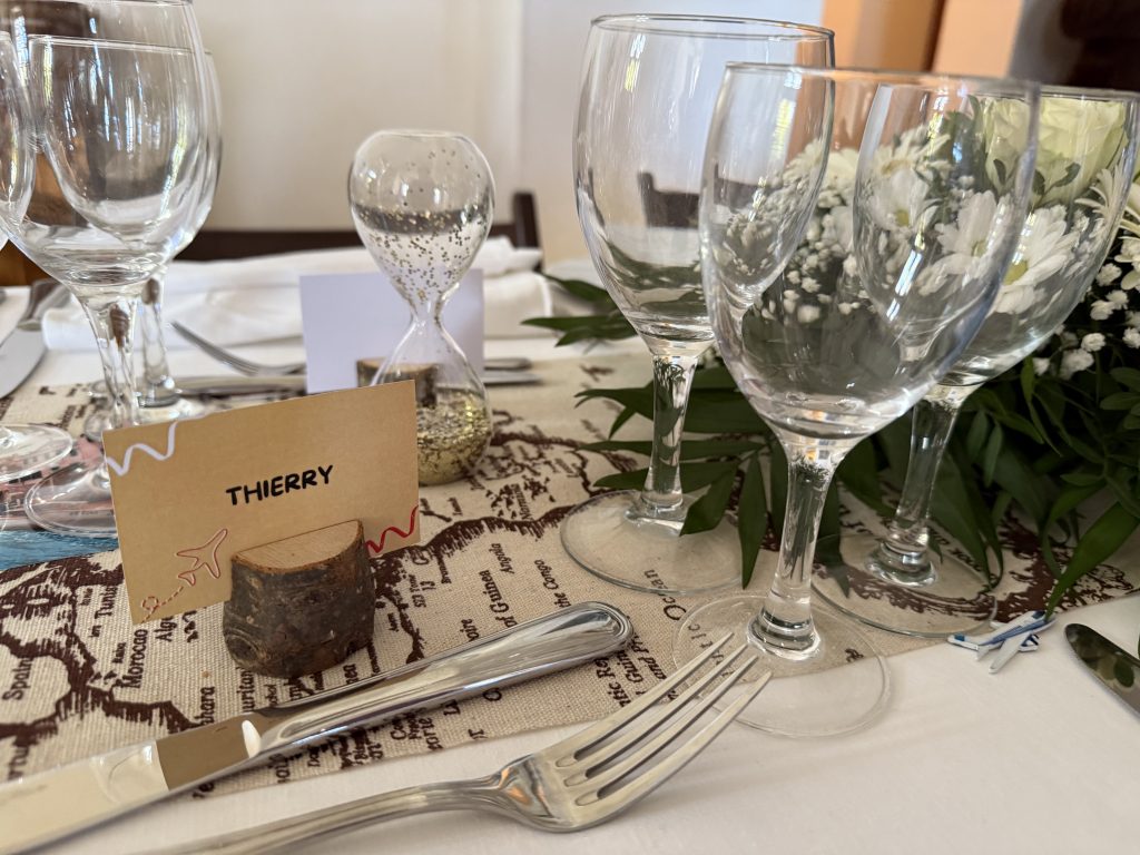 Le client ayant choisi un thème « Voyage à travers le monde », j’ai créé une décoration immersive en intégrant des éléments tels que des sabliers, des mappemondes et des photos de voyages. Chaque détail a été sélectionné pour renforcer l’atmosphère d’aventure et d’évasion, permettant aux invités de s’évader à travers des destinations lointaines et de vivre une expérience visuelle unique.